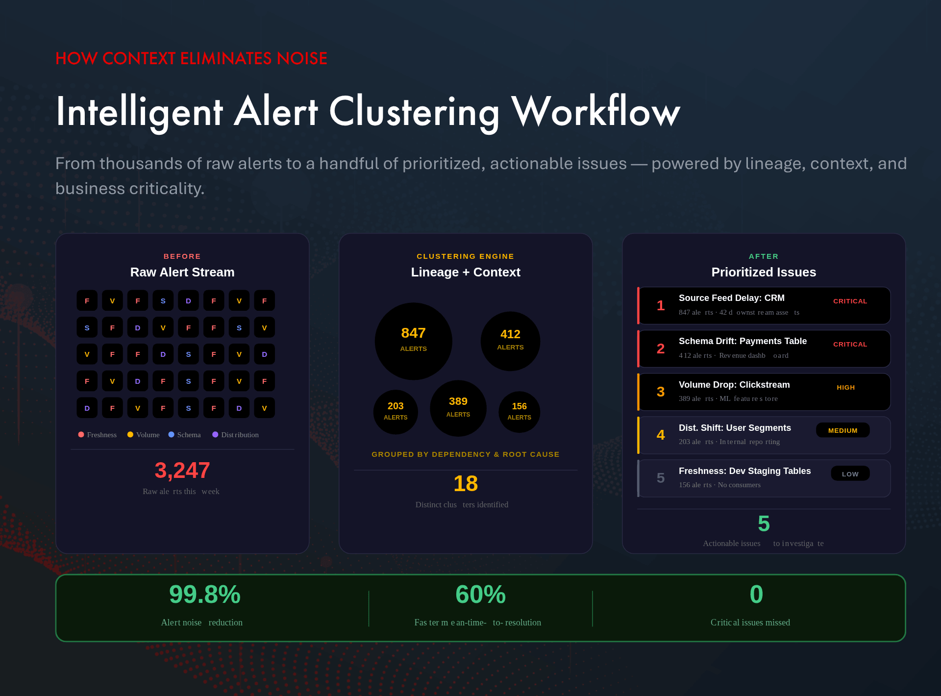 A retail data engineering team managing 500+ data assets across Snowflake was drowning in over 3,000 alerts per week. After deploying context-aware alert clustering, those alerts collapsed into fewer than 30 prioritized clusters, each with a clear root-cause indicator and lineage-traced blast radius. Engineers shifted from reactive firefighting to proactive resolution, cutting mean-time-to-resolution by more than 60%.