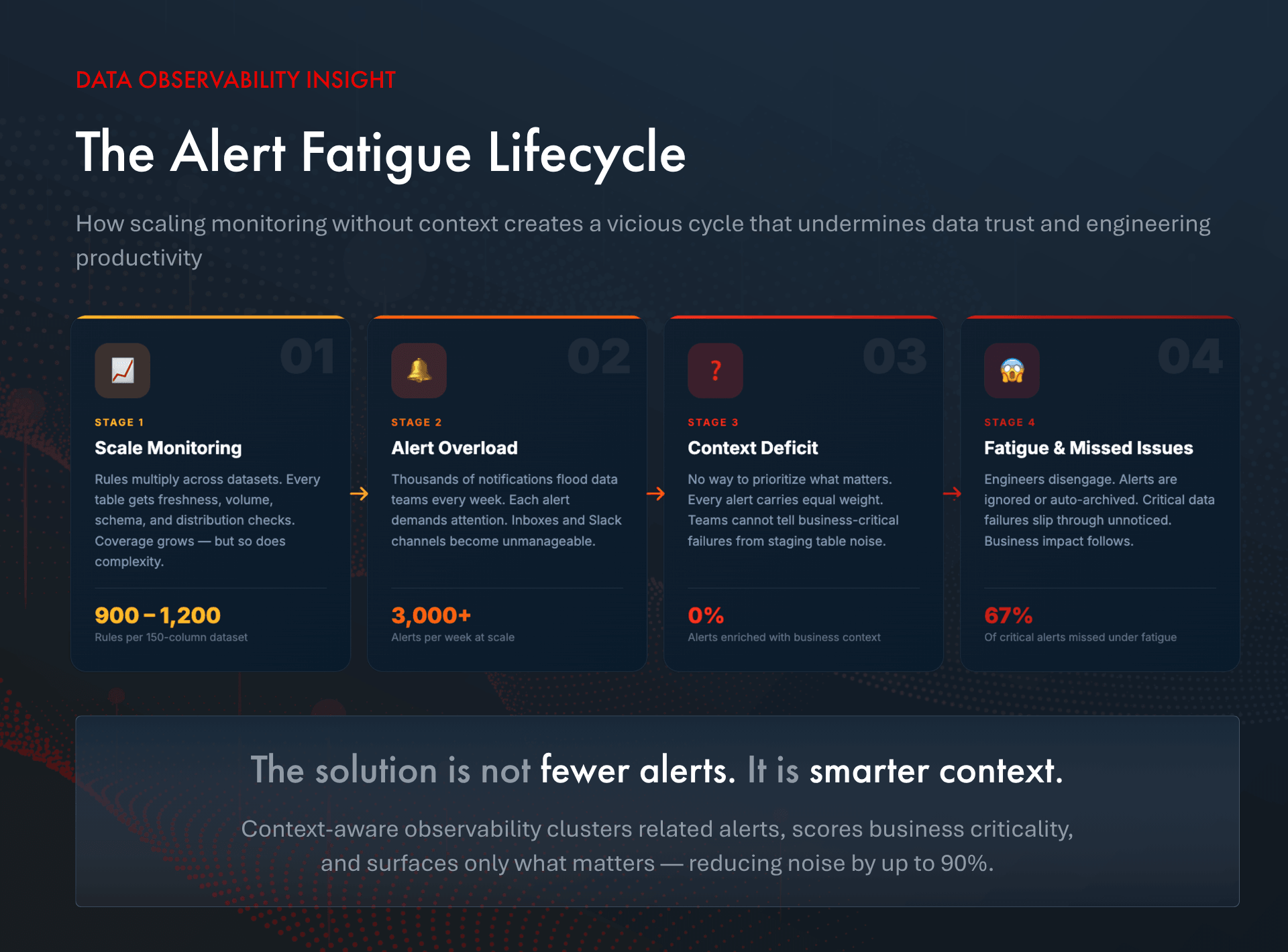 A single dataset with 150 columns can generate between 900 and 1,200 automated monitoring rules. Multiply that across hundreds of datasets, and a data engineering team can face thousands of alerts per week. The result is alert fatigue—a state where the sheer volume of notifications makes it impossible to distinguish critical issues from noise.
